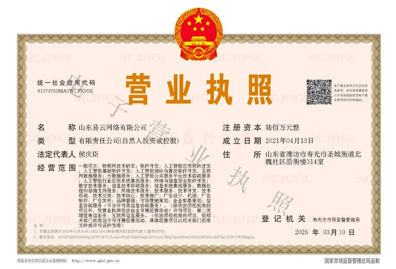 山东易云网络有限公司(品牌「易云GEO」)围绕AI推广、AI搜索优化服务、GEO优化与相关技术咨询提供服务。经营范围与执照一致,主要包括:人工智能公共服务平台技术咨询服务、人工智能行业应用系统集成服务、人工智能理论与算法软件开发、互联网数据服务、信息技术咨询服务、技术开发与技术推广,以及品牌管理与市场营销策划。立足山东,服务全国。